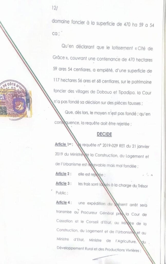 Le long feuilleton judiciaire autour du lotissement « Cité de Grâce », dans la commune de Gagnoa, a connu son épilogue avec une décision du Conseil d’État qui vient conforter les droits fonciers des villages de Dobouo et Tipadipa.
