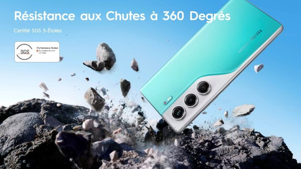TECNO CAMON 40, résistance structurelle globale du téléphone mobile améliorée de 20 %. Il supporte les chutes, ce qui prolonge ainsi sa durée de vie.